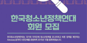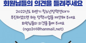 안녕하세요. 한국청소년정책연대입니다.2022년도 하반기 우리 청소년정책연대가 관심을 갖고 추진하였으면 하는 정책사업이 있으시면 제안해 주세요회원님들의 고...