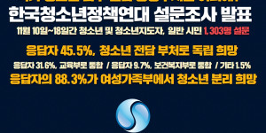 안녕하세요. 한국청소년정책연대입니다.한국청소년정책연대가 지난 11월 10일부터 18일까지 8일간 전국 청소년 및 청소년지도자, 일반 시민 1,303명을 ...