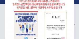 한국청소년정책연대 대선특별위원회 위원 위촉 안내 (2021. 7. 31) 안녕하세요. 한국청소년정책연대입니다.2022년 3월 9일, 제20대 대통령 선거...