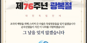제76주년 광복절 기념 안내 (2021. 8. 15) 제76주년 광복절을 기념합니다.조국의 해방을 위해 스러져 간 수많은 독립영웅들을 잊지 않겠습니다. ...